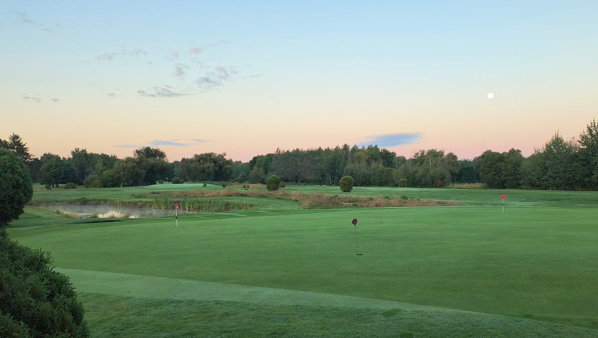 Vue sur le vert de pratique à l'aurore - Club de Golf Saint-Simon